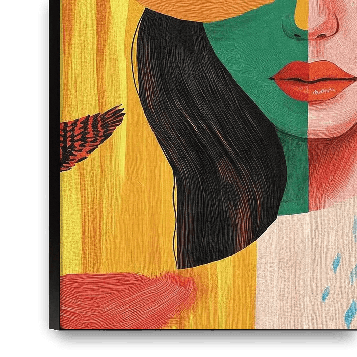 This colourful and modern artwork is characterised by expressive shapes and bold colour contrasts.The painting depicts an Indian or South American native woman in expressive colours and images of tropical fish. With a palette of hues such as red, blue, it brings energy and visual appeal to any space. The woman gives a contemporary look…