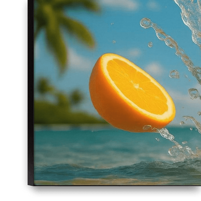 A pineapple shoots up out of the water while floating orange slices create a playful dynamic. Bright sunshine reflects in sparkling droplets, with palm trees and a calm sea in the background. The warm fruit contrast pops against the cool air and water, giving the image an energy and summery freshness. Subtle shadows and glossy accents…