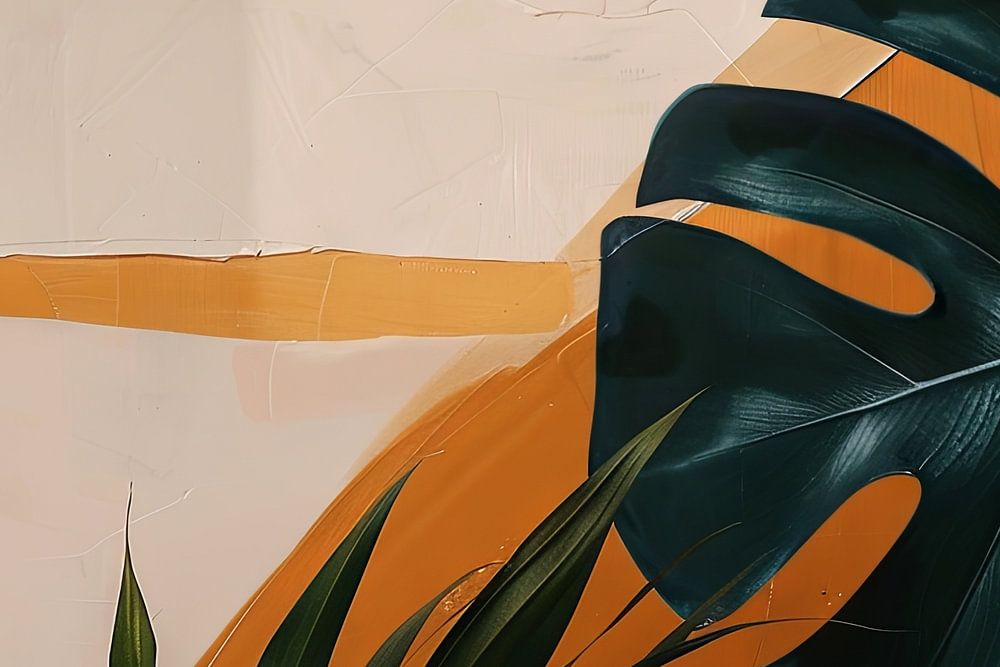 This modern painting combines geometric shapes with vibrant, tropical leaves to create a fascinating composition. The lush green tones of the leaves contrast harmoniously with the warm earthy colours and cool pastel tones in the background. The clear lines and balanced colour palette give the work a contemporary, calming aura. Inspired by abstract art, this painting brings the beauty and tranquillity of tropical nature into a modern context.
