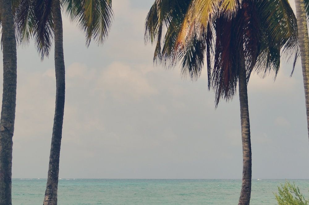 A few palm trees by the turquoise sea, on a Colombian island. A peaceful tropical atmosphere evoking relaxation, with soft colors.
