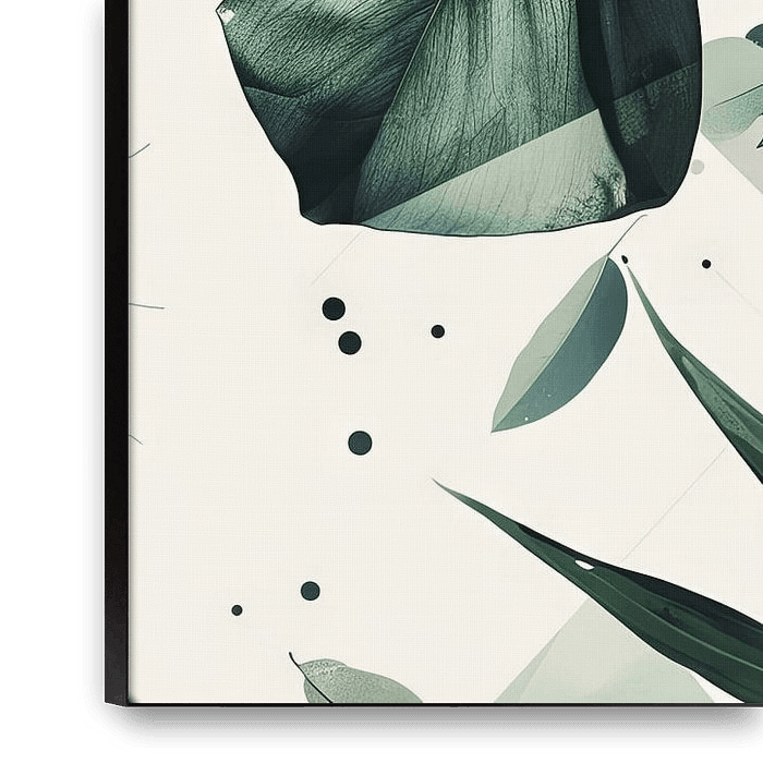 This artwork shows a lively composition of tropical leaves in a modern style. The large, bold monstera leaves harmonise with other tropical plants and create a lush and exotic atmosphere. The green and blue tones of the leaves contrast with the geometric shapes in the background and give the artwork a contemporary touch. Perfect for…