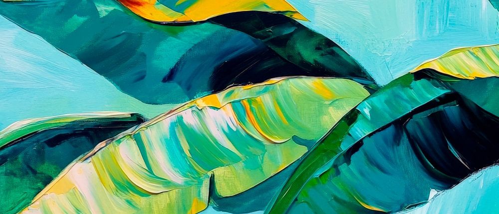Vibrant green leaves dance against a soft aquamarine background, bringing a sense of calm and holiday mood to any room. The eye-catching colours and dynamic shape of the leaves add a fresh, tropical touch that is perfect for a bedroom or kitchen to create an inviting atmosphere.