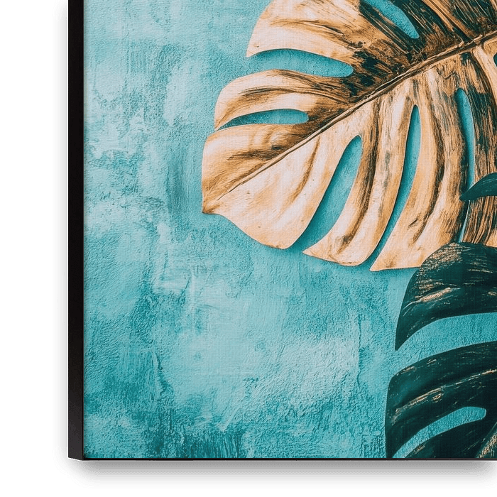 Green giants spread out against a gently polished, aquamarine background. Their deep, shady incisions and the lively, golden-brown accents tell of a tropical oasis where the light plays. Here, nature blends with a touch of elegance and timeless tranquillity. A quiet retreat in the jungle of everyday life.
