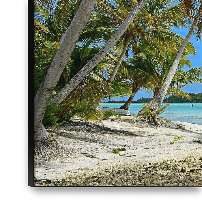 Hanging palm tree on a tropical white sand beach on an island with a blue sea in the lagoon of the Tahiti archipelago French Polynesia in the Pacific Ocean.