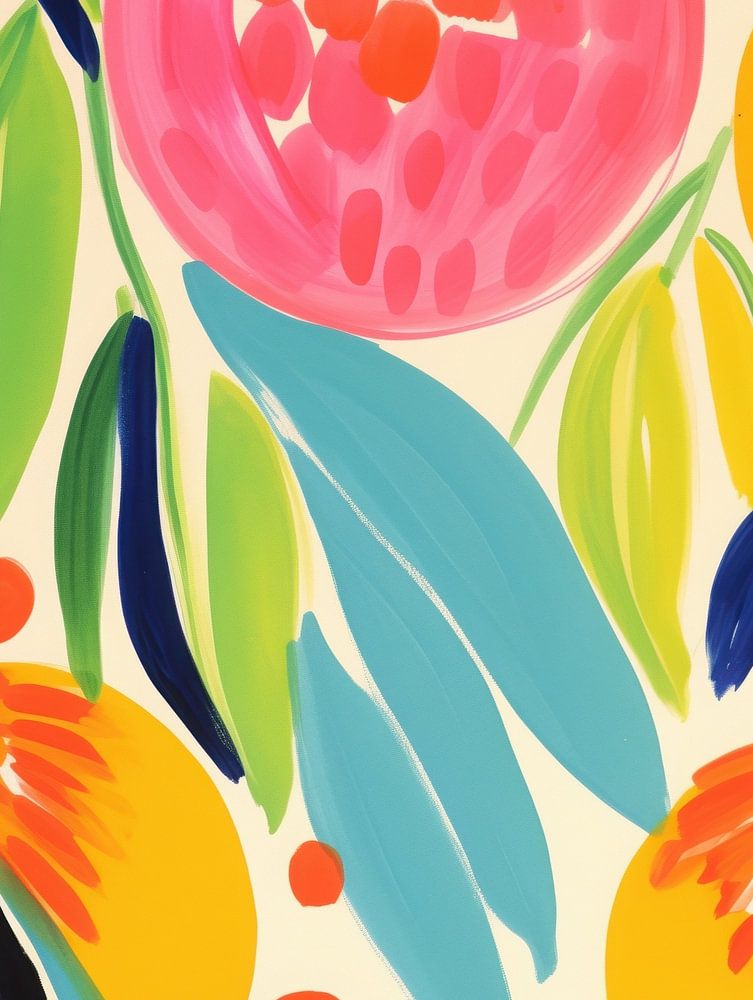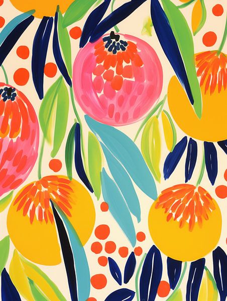 This work is pure, sun-drenched lightness: Juicy, pink pomegranates, bright yellow oranges, and blossoms dance amidst deep blue leaves and cheerful turquoise-green stems-all on a creamy background dotted with red berry blossoms. The style is incredibly joyful and relaxed: flat, radiant surfaces, playful repetition, pure delight. The…