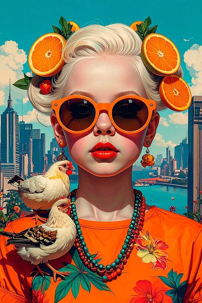 A surreal, pop-art-style image of a pretty girl with white-blonde hair. She has bright orange orange slices in her hair, small chickens sitting on her shoulder and chest, and she is wearing orange sunglasses. Her orange floral-print outfit and the beaded necklace she is wearing give the whole image a retro feel. A blend of reality and…