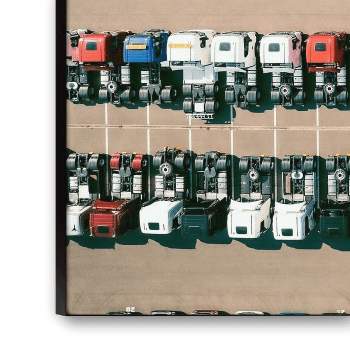 About "Trucks in a row at a parking lot seen from above"