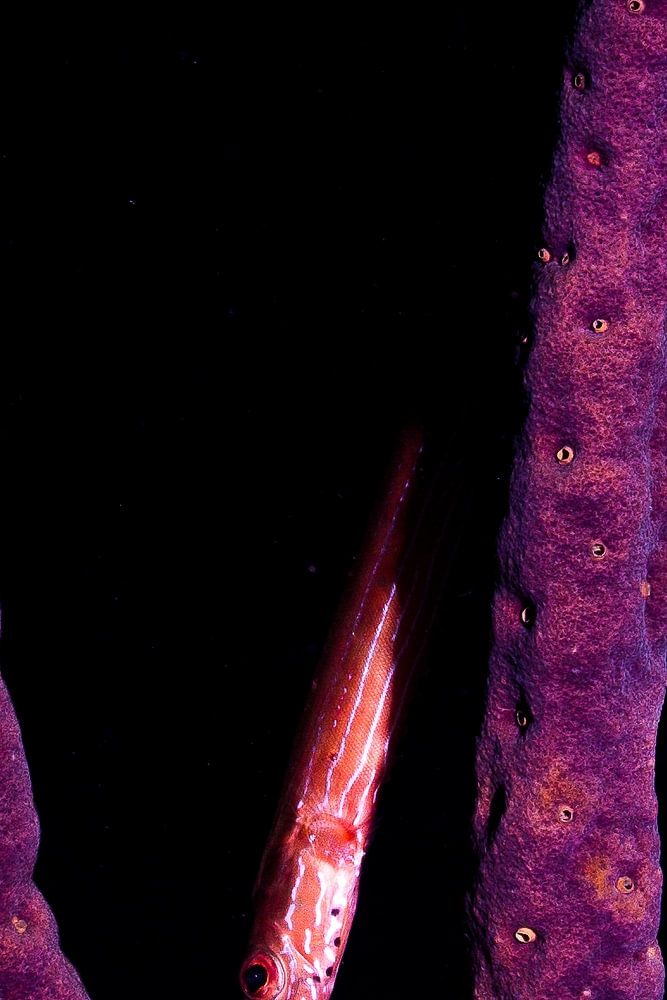 Un trumpet fish between 2 sponges, at night.
