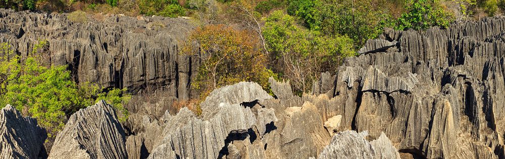 Prachtige panoramische opname van natuurpark Tsingy de Bemaraha in Madagaskar op een mooie zomerse dag. De Tsingy bestaat uit een uitgestrekt landschap van scherpe geërodeerde rotsen en is een belangrijke toeristische trekpleister