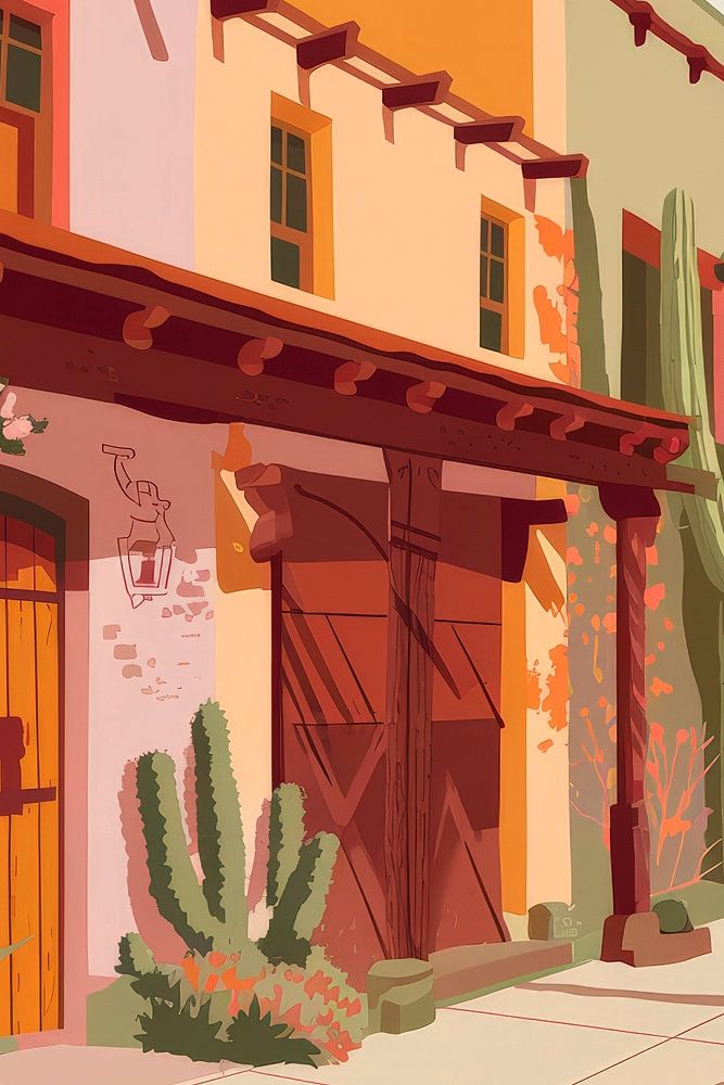 Embedded in the warm colours of Tucson, the charming, adobe-like houses radiate peace and joie de vivre. Lush cacti and soft contours invite you to dream. Ideal for the living room, this work of art brings a slice of south-western serenity and inspiring holidays to any room.