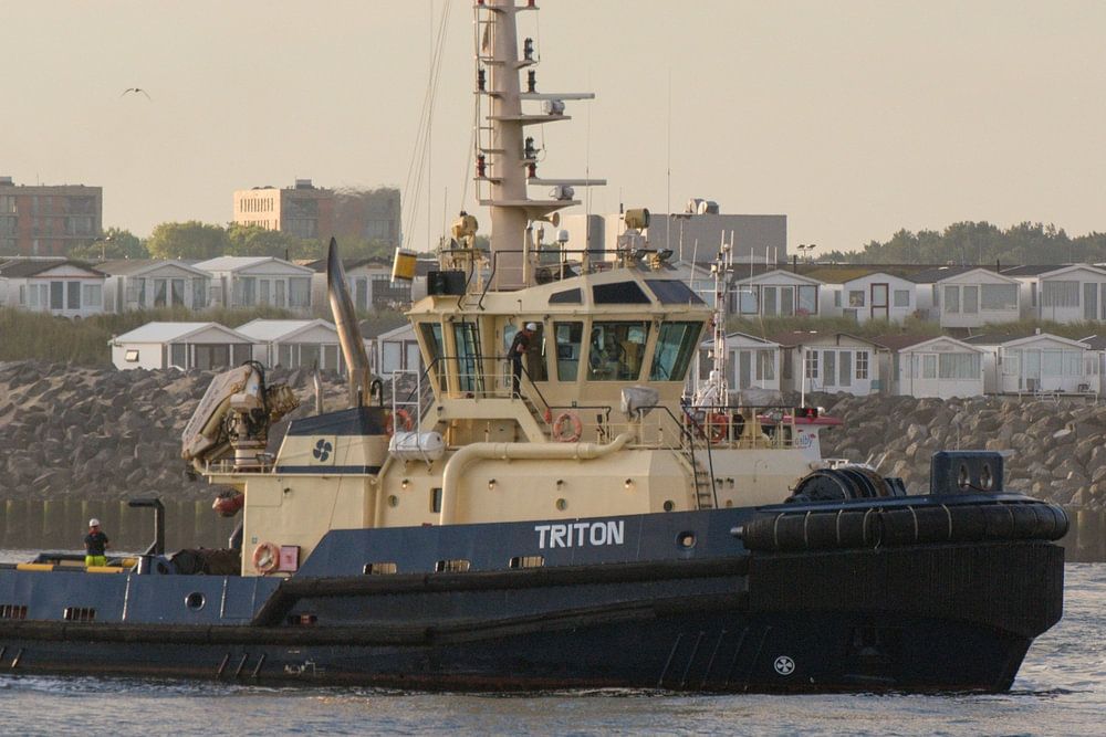 Tugboat Triton ready for action waiting for an incoming sea ship. Waiting at the vacation homes near the beach of IJmuiden. The crew of the tugboat is getting ready by laying out the mooring lines.