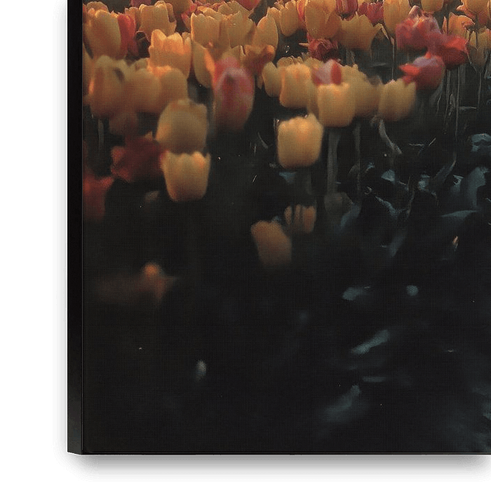 At sunrise, endless rows of tulips unfold across the Dutch countryside, glowing softly in the first light of day. Red, yellow and pink flowers create a vibrant yet calming pattern, leading the eye toward the horizon. A narrow canal runs through the field, subtly reflecting the warm tones of the morning sky.