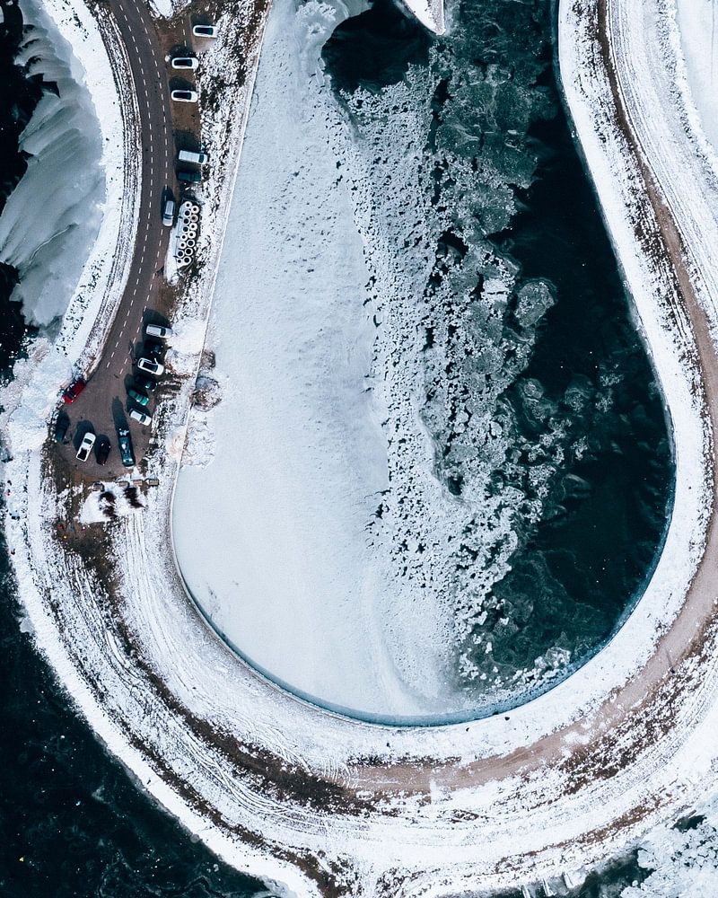 In Flevoland you find this special island in the shape of a tulip. The photo is taken in the winter while people are enjoying the frozen water.