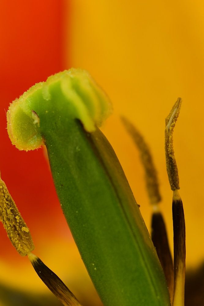 Through the macro lens, you see the exquisite beauty of the tulip's flower bud.
