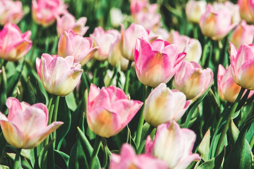 A picture of a tulip field, you see light pink tulips pointing a little to the right.