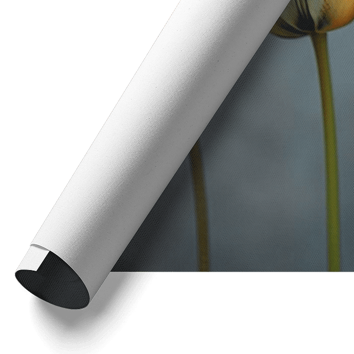 This photo-realistic painting shows a row of tulips in various colours, exuding a subtle transience. The flowers stand dead straight on their long, slender stems, while their petals display a mix of warm and cool hues-varying from deep reds and oranges to cool blues and soft yellows. The background is soft and out of focus, with a mixture of shades of blue and brown, further highlighting the flowers and creating a dreamy, almost melancholic atmosphere.