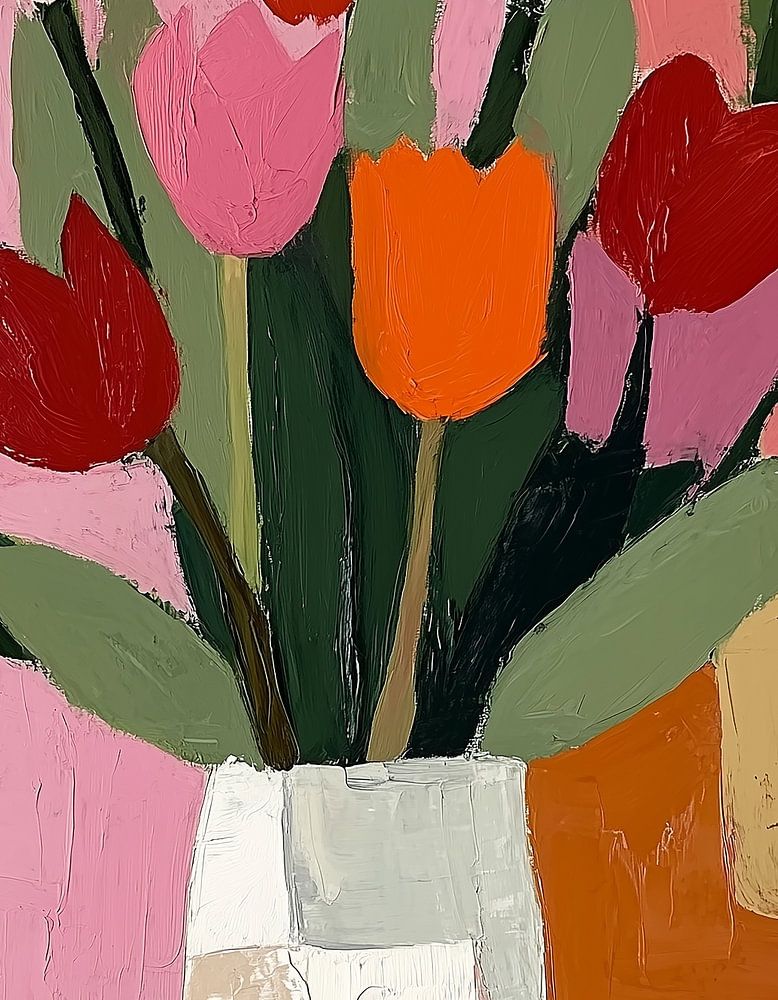 In Tulips in Planes, the classic still life of a flower vase is reinvented in a contemporary way. The tulips, normally graceful and natural in form, are captured here in a stylised, almost abstract composition in which areas of colour play the leading role. The flowers are composed of bold, even colours - white, red, orange, purple and pink - which stand out powerfully against a background of geometric planes in warm earth tones and cooler pastels.