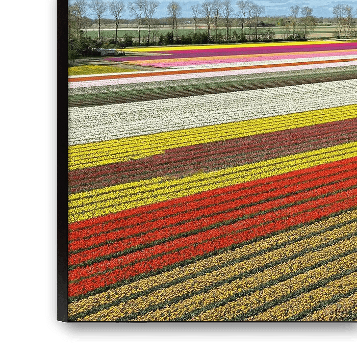Red, yellow, white and pink tulips growing in agricultural fields in the Noordoostpolder in Flevoland, The Netherlands, during springtime seen from above with a cloudy sky above. The Noordoostpolder is a polder in the former Zuiderzee designed initially to create more land for farming and is one of the largest flower bulb cultivation areas in Holland..