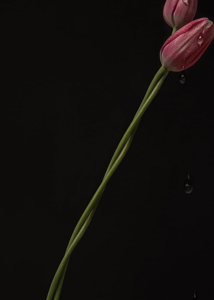 This work consists of two pink tulips whose stems have grown around each other. They are so intertwined that letting go and blooming separately is impossible. The small falling drops of water make it seem as if they are both crying because they cannot manage to let go of each other.