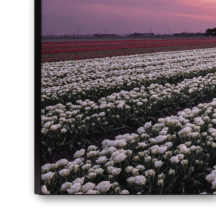 Buy this landscape artwork Tulips sunset by Jeroen Linnenkamp on canvas, ArtFrame, poster and wallpaper, printed on demand in high quality.