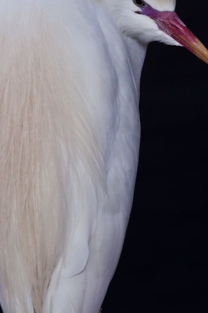 Turning over his shoulder, a dazzling = white Egyptian heron on a black background looks at you by Michael Semenov
