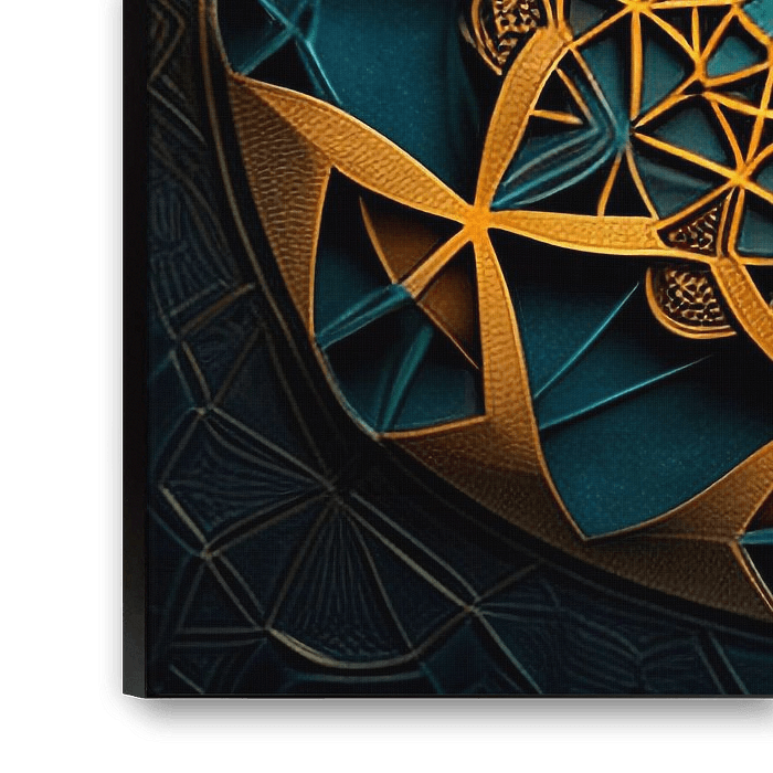 "Turquoise & Gold Nexus" features a fascinating geometric pattern with interlocking shapes in rich gold and teal tones. Set against a dark background, the design radiates symmetrical precision and dynamic elegance. This eye-catching artwork adds a sophisticated, modern touch to interiors and is perfect for anyone who appreciates texture, balance and bold colour contrasts.