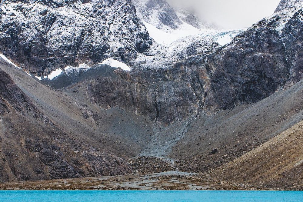 A breathtaking alpine scene showing the sheer power and beauty of nature. Two colossal, steep mountain walls, covered in rugged rock and fresh snow, surround a hidden glacial lake. The water in the foreground has an incredible, vibrant turquoise blue colour, which contrasts brilliantly with the grey, cold tones of the mountains and the looming, low clouds above. The foreground of rough, dark stones invites the viewer into this inhospitable but spectacular landscape. This image is an excellent choice for an interior that could use a fresh, bright injection of colour and a sense of adventurous grandeur.