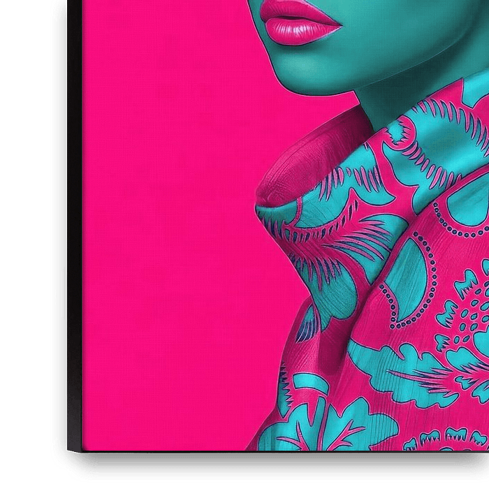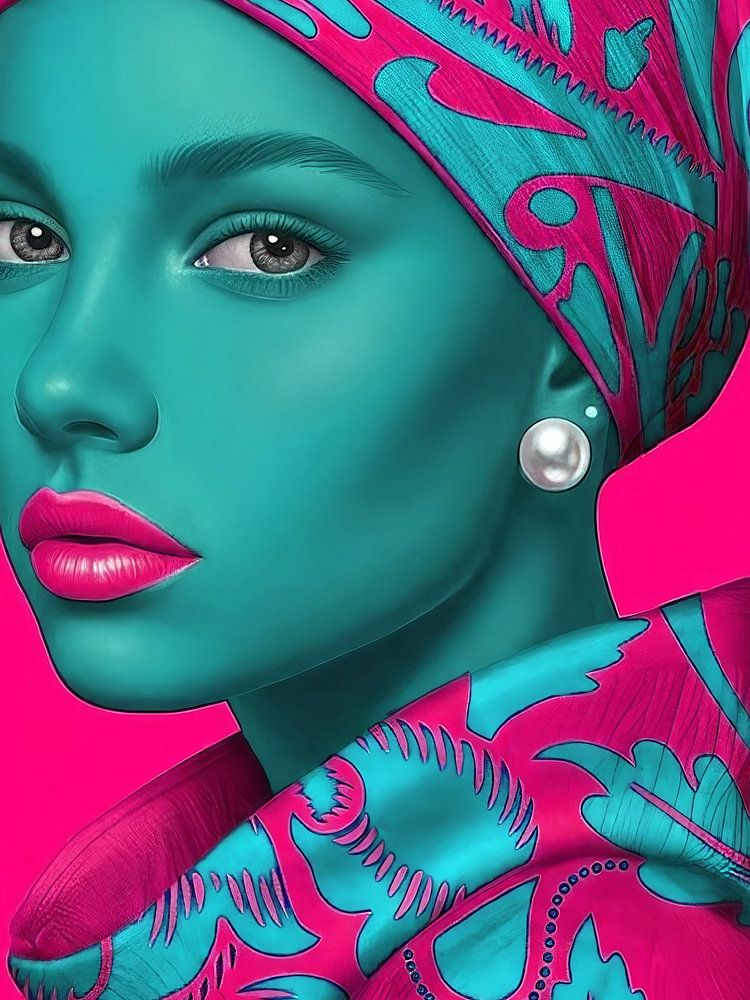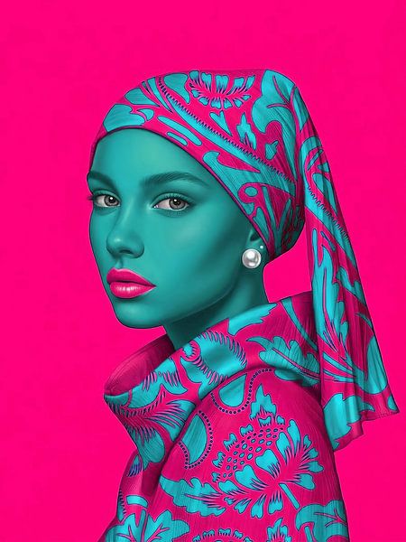This digital artwork by artist René van den Berg is a powerful, contemporary interpretation of the Girl with a Pearl Earring. The classic profile and iconic pearl earring remain recognisable, but are radically renewed through the use of bright, contrasting colours. The face is rendered in an intense turquoise, which contrasts sharply…