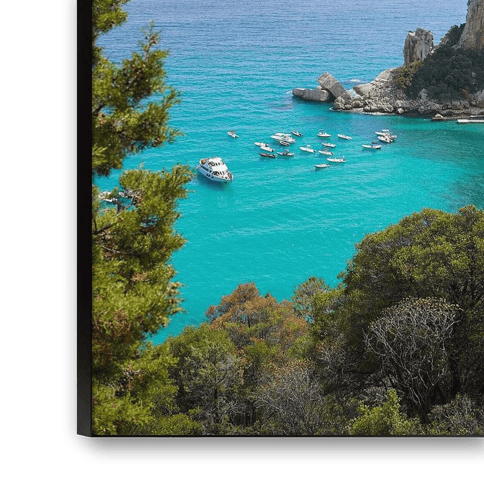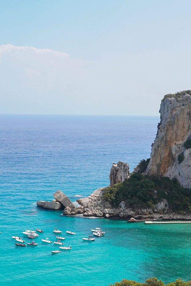 Small boats bob peacefully in the sheltered bay, surrounded by high cliffs and green vegetation. The air is clear, the sea calm, a moment of pure tranquillity and summer simplicity.