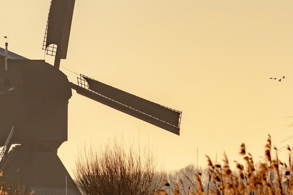 Twight light sunrise on the Unesco heritage windmill silhouette at the middle of the canal, Alblasserdam, Netherlands