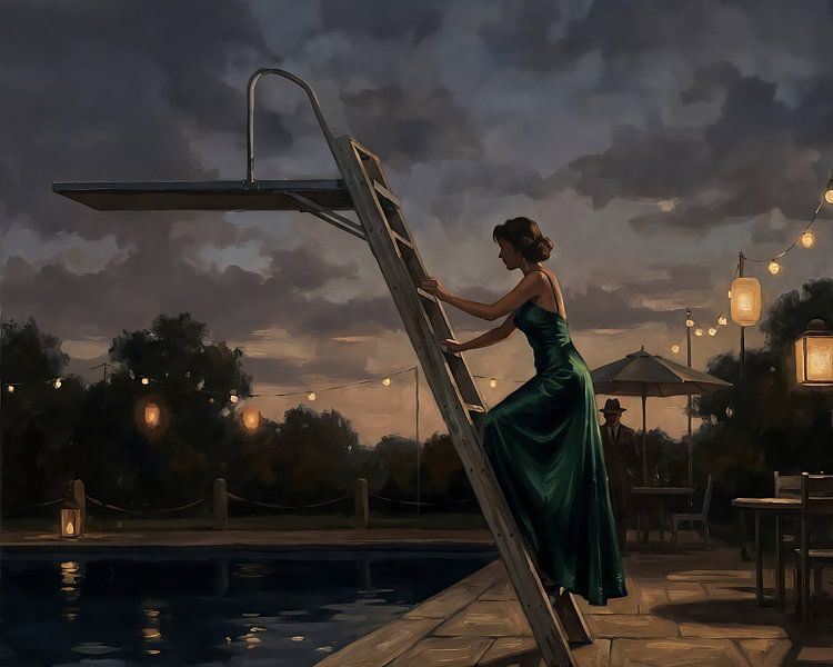 This painting captures a moment of quiet tension and elegance, set against the backdrop of an evening gathering. As the artist, I sought to evoke a sense of mystery and anticipation, blending the serene with the dramatic. The central figure—a woman in a flowing green gown—ascends the ladder of a diving board, her posture poised yet…