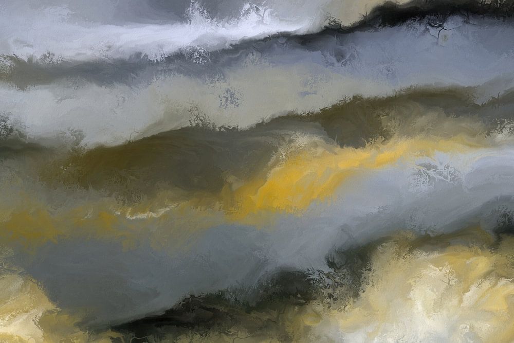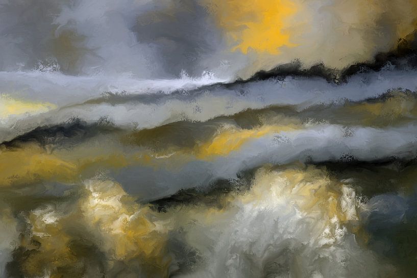 A serene landscape shows rolling hills, adorned with patches of yellow and gold flowers. Soft, muted colors blend together, creating a tranquil and dreamy ambiance.