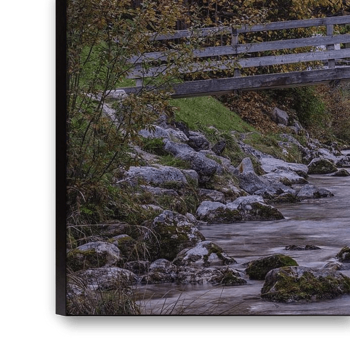 In the foreground, a rustic wooden bridge crosses the fast-flowing Ramsauer Ache (river), leading the view to the iconic church. The river flows over the rocks, captured with a slightly slow shutter speed, giving a soft and flowing effect. The majestic mountains in the background are cloaked in a cool, blue-purple hue, contrasting beautifully with the warm autumn colours of the trees on either side.
