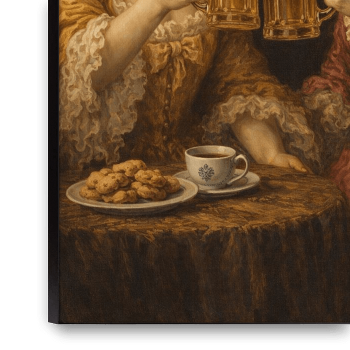 This classically painted artwork with a wink once again features a strong woman – or rather two: sisters who fill the tavern with their presence. At first glance, they appear neat and elegant, with coffee and biscuits on the table, but their mischievous smiles betray their secret: as soon as no one is looking, they secretly pull out two…