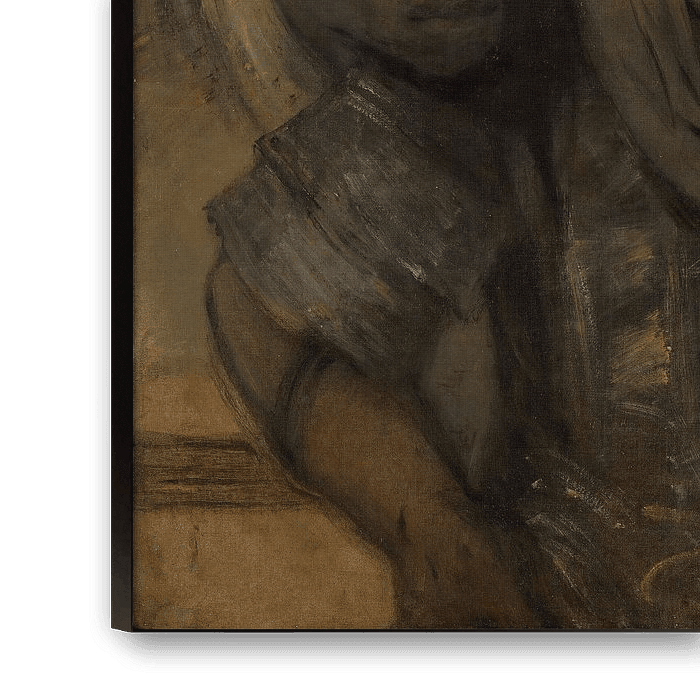 Rembrandt painted the men in very thin layers of paint. Although he depicted their faces, like the white shawl, in great detail, many other parts are only sketchily painted. The painting looks like an unfinished study, but the artist signed it: Rembrandt f 1661 – made by Rembrandt in 1661.