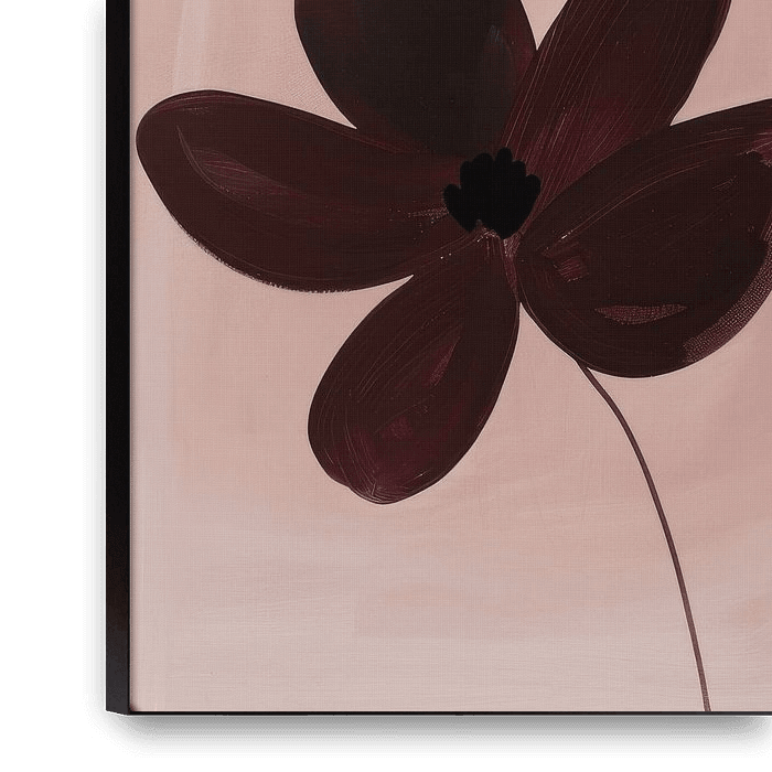 This artwork presents two large abstract flowers painted in deep burgundy tones against a soft blush background. The composition is simple and balanced, allowing the shapes of the flowers to become the main focus of the image. Each flower is formed from broad painterly petals that appear slightly translucent, revealing subtle brush…