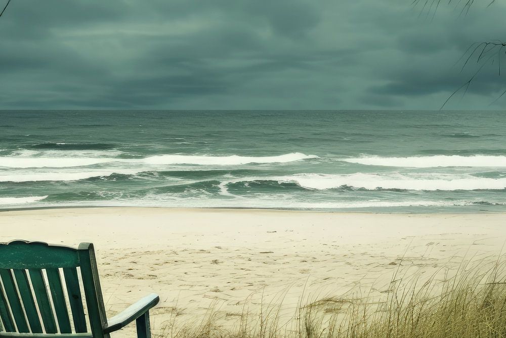The sky is heavy with grey clouds heralding an approaching storm. The beach is deserted and it seems as if time has stood still here. The tempestuous waves break with force on the sand, and their sound fills the air with a rushing cadence. The chairs invite contemplation and offer a front-row seat to the mighty nature.