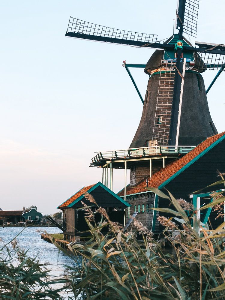 About "Two Dutch windmills on the water in Zaanse Schans just after sunset during the blue hour"