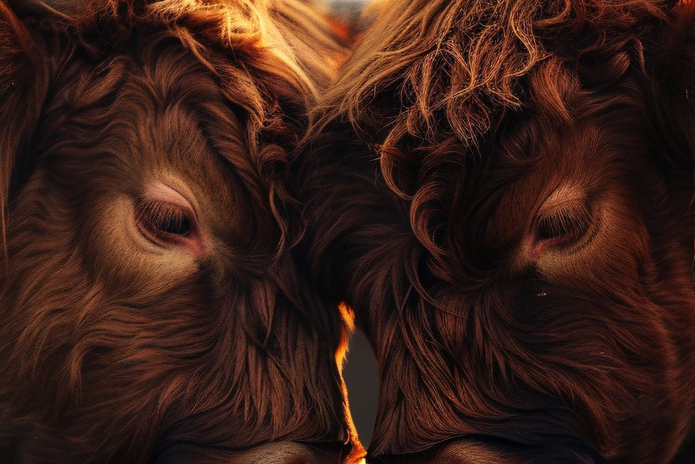 This stunning image shows two majestic Scottish Highlanders meeting head-to-head at dusk. The warm, glowing colours of the setting sun illuminate their thick, wavy fur and sharp horns, creating a dramatic and mesmerising scene. The attention to detail and realistic style perfectly capture the strength and beauty of these imposing animals. This artwork adds a touch of natural splendour to any room, be it the living room or dining room. An ideal piece for lovers of animal photography and nature, it exudes both tranquillity and dynamism.