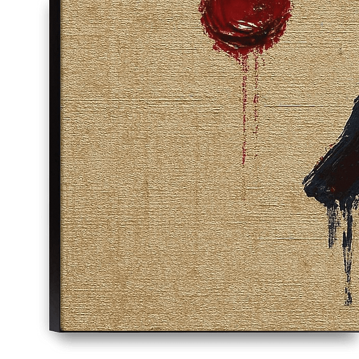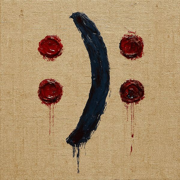 Thick, wild oil paint in deep red and dark blue builds up the :): symbol like an emotional outburst on weathered canvas. The paint drips and clumps in heavy impasto layers — every brushstroke carries the energy of a story that needs to be told. Where the red and blue meet, dark, almost black hues emerge, marking the boundary between two…