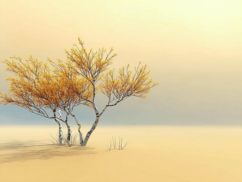 Two trunks growing from the same root — separate, yet inextricably linked. They stand in an endless expanse of soft ivory and warm gold; the mist has swept away everything that is superfluous. Only them. Only this. The palette is subdued and warm: ochre gold, soft…