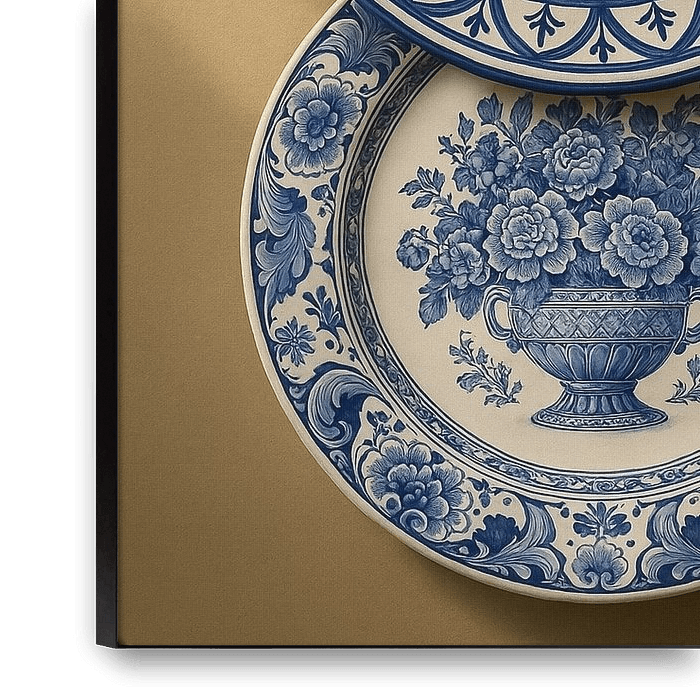 In this work, a Moroccan plate and a Dutch Delftware plate meet in one harmonious composition. The upper plate bears the typical Moroccan geometric and rhythmic motif, while the lower plate, on the contrary, exudes the refined floral style of traditional Dutch Delftware.