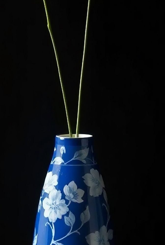 Two elegant white daisies rise from a glossy royal blue vase with white floral decoration. A powerful and minimalist still life with deep contrasts and a touch of romance.
