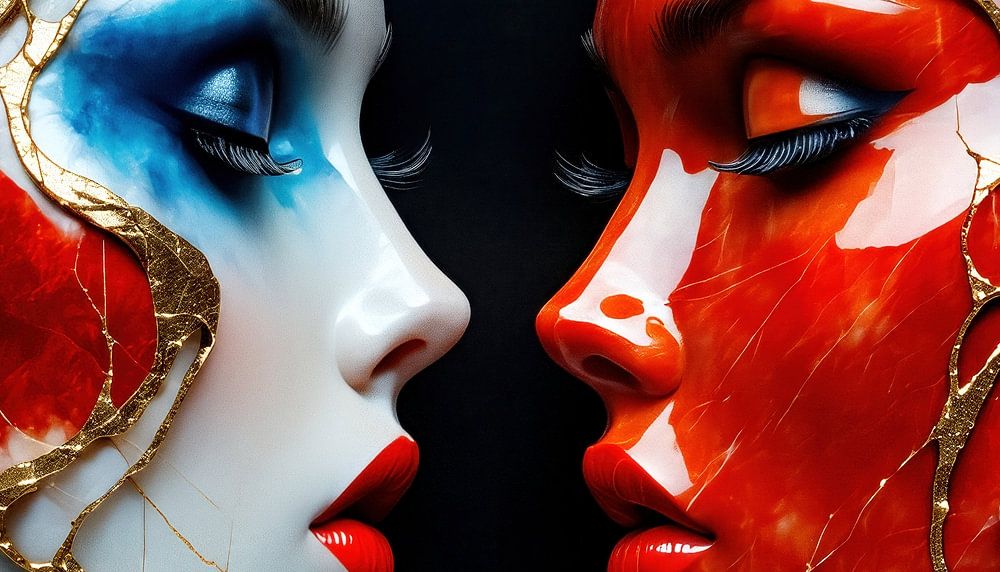 Large hibiscus flowers in rich red and deep blue nestle around the women's heads. They frame the faces with gentle lightness, as if they were adapting to the contours without overgrowing them. Their leaves almost seem to breathe, still and yet full of life. Golden veins run across the women's necks - and only at the edges of their faces - like fine cracks in a precious sculpture, yet they do not bear witness to fragility, but to the beauty of lived experience. Occasional gemstones sparkle amidst the golden lines, as if they were precious memories set in the course of time. They lend the picture an almost unearthly elegance, a sense of eternity in which the contrasts do not dissolve, but unite in a harmonious, sublime moment.