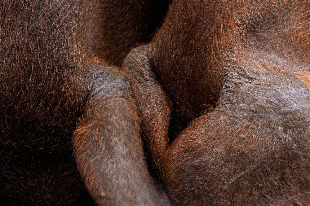 With their snouts buried deep in the dark earth, the two pigs stand imperturbably side by side feasting. They seem completely absorbed in their quest, as if the world around them does not exist for a moment. The soft, reddish hair on their backs moves with every enthusiastic push they make, while their ears hang down in complete concentration.