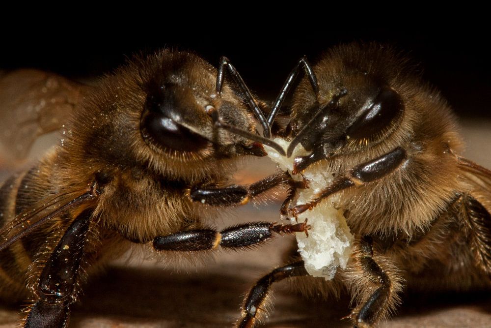 Two honey bees fighting over piece of wax by Joost Adriaanse