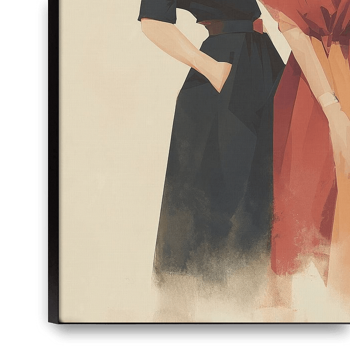 A captivating artwork depicting two elegant women in vintage style, dressed in refined dresses and striking large hats. The subtle color palette of soft beige, black, and terracotta hues exudes a nostalgic glamour. Their intimate conversation speaks of friendship and refinement, while the artistic, watercolor-like style exudes a…