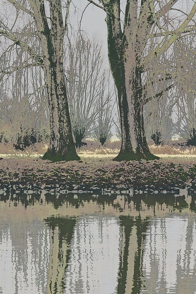 This photograph was taken during a walk on a grey winter's day. It is a photograph of two trees along the River IJssel, which I edited in Photoshop. They are reflected in the River IJssel.