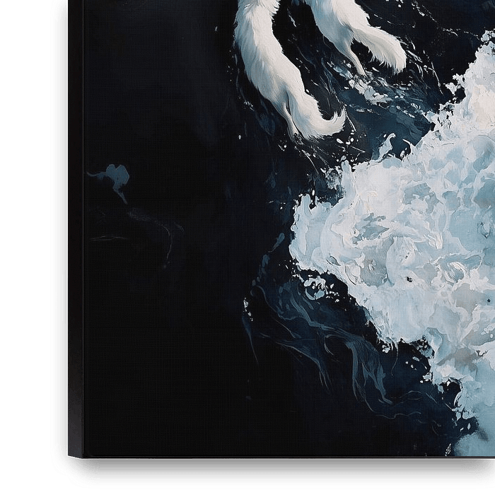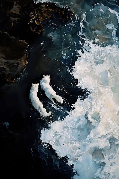 This expressive artwork depicts two white wolves moving powerfully through the roaring water. The dynamic waves surround the animals and emphasise their strength, freedom and close bond. The contrast between the dark sea and the light fur textures gives the scene a dramatic yet mystical atmosphere that impressively captures the wild…