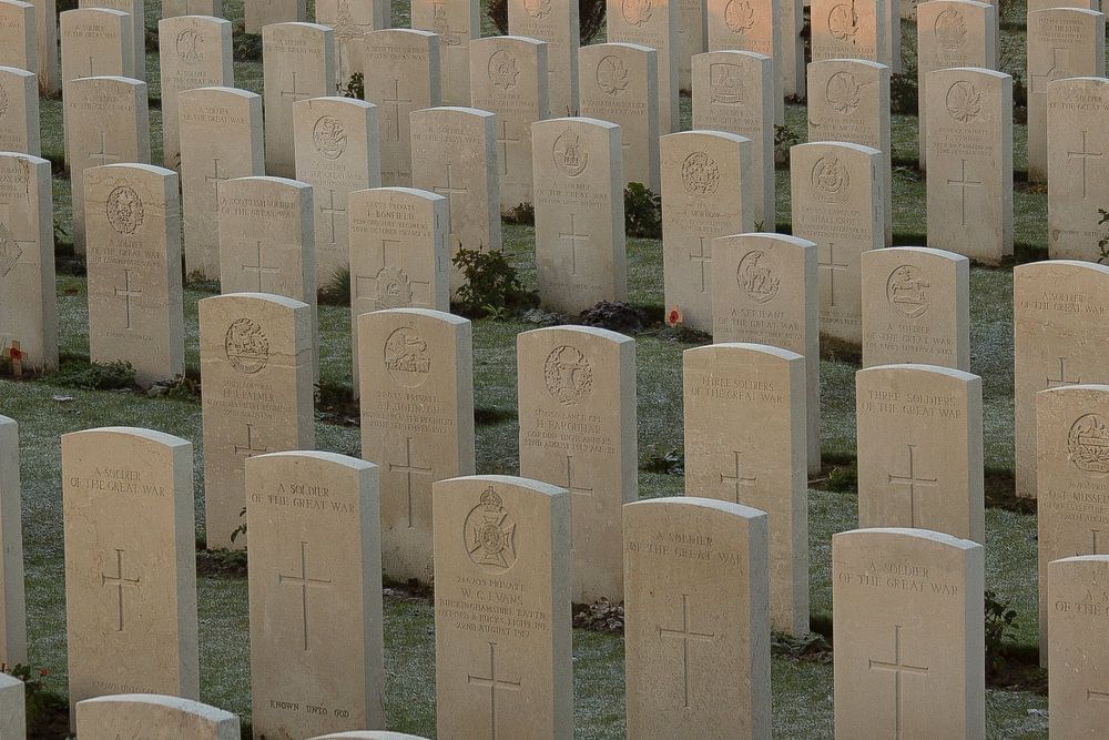 Sunrise over the Tyne Cot Cemetery, here lie many victims of the First World War. The cemetery is located in Zonnebeke, West Flanders, Belgium, a short distance from Ypres.